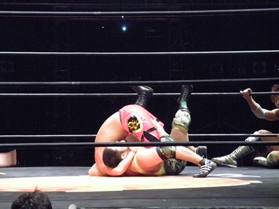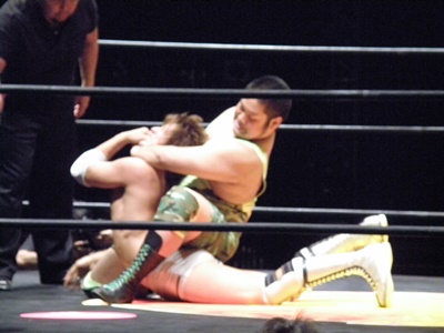 石井が入江をジャーマンで投げ、安部がジャックナイフに固める(左写真)、カウントは2。