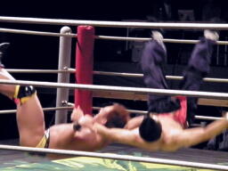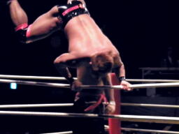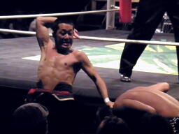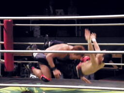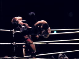 チョップの打ち合い、マイケルエルボー連打でコーナーに詰める(右写真)、対角線コーナーに振って突っ込むが趙雲かわし中華式619。コーナーに上ってアトミックボムズアウェイ、カウント2。5分経過。