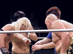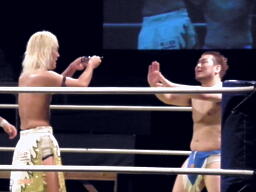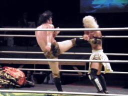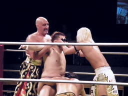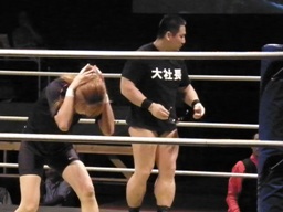 それでもやりたそうな星誕期、鳥羽がサングラス取り上げる(右写真)。鳥羽と佐藤が星誕期にサンドイッチミドルキック。