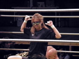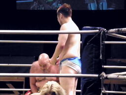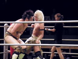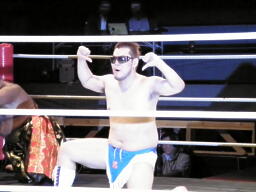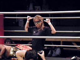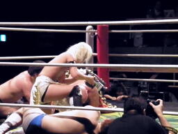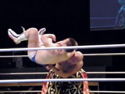 鳥羽素手でパンチ(左写真)、ダブルダウン。グレースがカウントを数え始める。本部席のマイク井上とカウントがずれる。「2?」「2・・・2・・・ツーサウザンド!」「CRASH」が流れる。