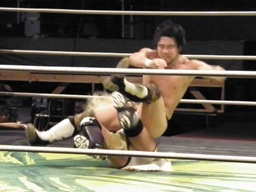 「CRASH」が流れ、佐藤は蝶野化、3人にケンカキック浴びせると鳥羽にSTF(左写真)