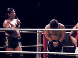 大鷲が「俺様は両国でアイアンマン、HARASHIMAはKO-D無差別級を失い、松ちゃんは今日来る途中傘を失くした」と説明。