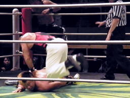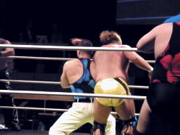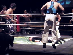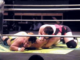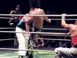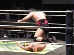 松永入ってトミーボンバー(左写真)、カウント2。松永ロープに飛ぶ、トーゴーがドロップキック。