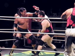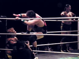 トーゴーが松永にパンチ(右写真)、ロープに振ってドロップキック、カウント2。腕をひねってPIZAにタッチ。