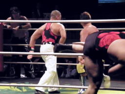 HARASHIMAハイキック(右写真)、両者ダウン。松永とトーゴーにタッチ。