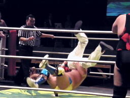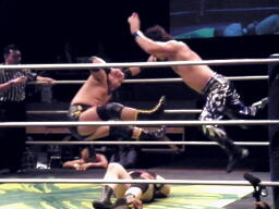 ダブルでロープに振ってガットショット、大鷲延髄蹴り、HARASHIMAビッグブーツ、大鷲チョークスラムからHARASHIMAのスワンダイブプレスと大鷲のギロチンドロップが同時に(右写真)。10分経過。