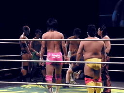 9/13大阪大会から若手リーグ戦「ヤングドラマ杯」が開催されることが発表。日程等はこちら。本日の第1試合はリーグ戦出場の6名による6人タッグ。全員リングに(左写真)。壮観だ。