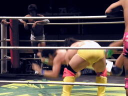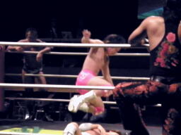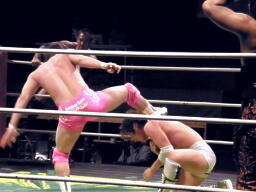 谷口ロープに振る、ガッバーナ切り返してトラースキック(右写真)、石井にタッチ。石井ドロップキック、谷口は安部にタッチ。