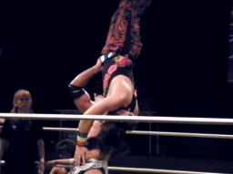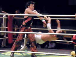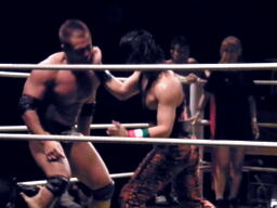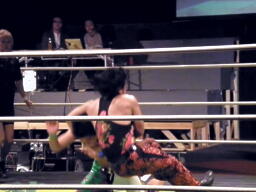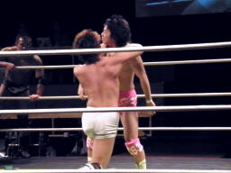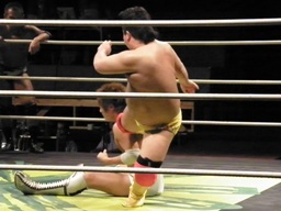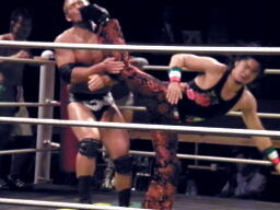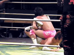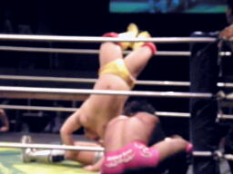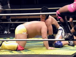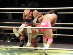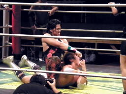 高尾フライングメイヤー、ガッバーナヘッドシザーズ。高尾もう一度フライングメイヤーからグラウンドヘッドロック(左写真)、両者立ち上がる。ガッバーナ自軍コーナーに押し込んで石井にタッチ。
