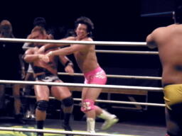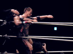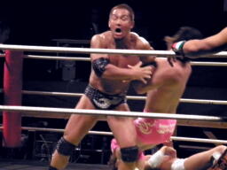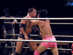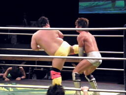 高尾が石井にエルボー(右写真)、石井もエルボー返す。石井ボディスラムからカバー、カウント2。ストンピング打ち込んで伊橋にタッチ。
