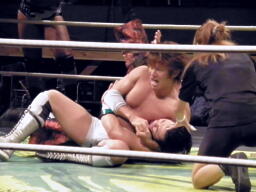伊橋張り手、ローキックからその場跳びムーンサルトプレス(左写真)、カウント2。