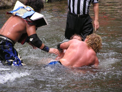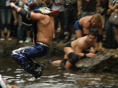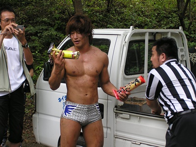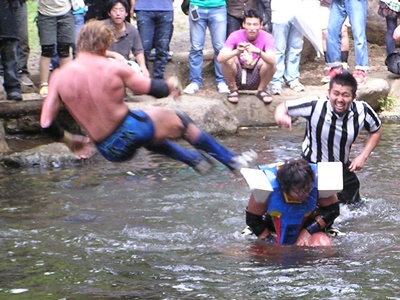 まず高木とマイケルが池に入る。今日も水温はかなり低そう。高木がシットダウンひまわりボム(左写真)、ケニーがカット。