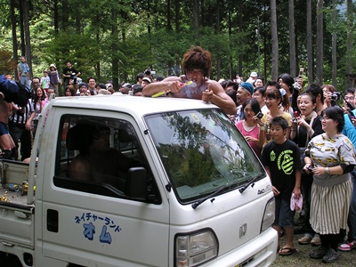 いつの間にか白樺広場に置いてあった軽トラック(キー刺さってたらしい)を見たHARASHIMAと飯伏が共闘態勢に(右写真)。