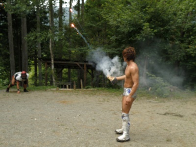 飯伏とケニーは「リアル波動拳」ということで岸から大型花火をマイケルに向けて撃つ(左写真)。