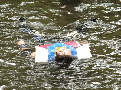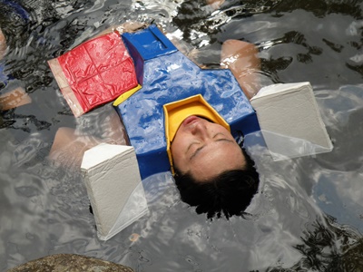 ドロップキックを食らったHARASHIMAはガンダムスーツのまま池をたゆたう(左写真)。