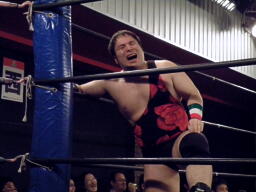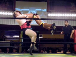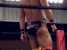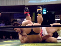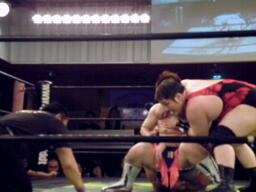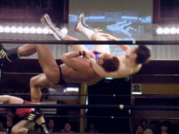 漁夫の利を得たとばかりに大きなフォームでマイケルがカバー、ディーノくるっと切り返して片エビ固め(右写真)、カウント1。累計21。