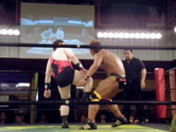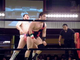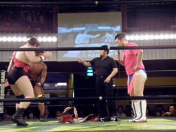 内容を聞いてもっと嫌がる松井レフェリー(左写真)。数え間違うと何なのでカウントは日本語で、という救済措置が取られることに。