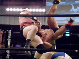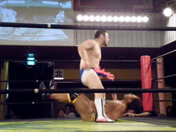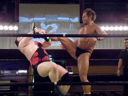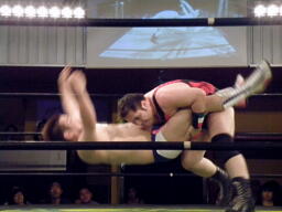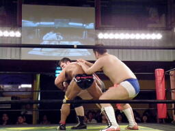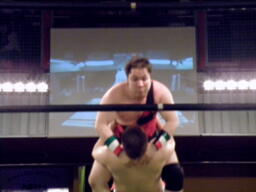 アントンロープに振る、ディーノ切り返すがアントンはテーズプレス(左写真)からパンチ連打、ロープに飛んでフォアアームドロップ、カウント2でマイケルがカット。累計カウント7。