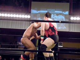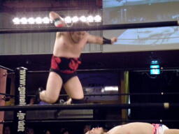 アントンコーナーに上ってダイビングフィストドロップ(右写真)、