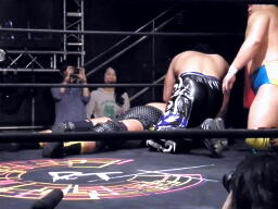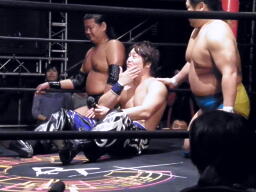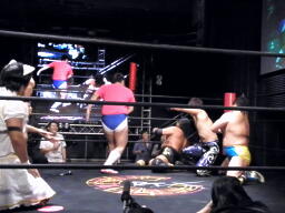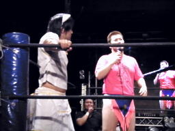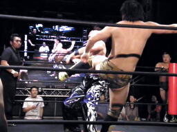 HARASHIMAが出る、佐藤ミドルキック(右写真)。HARASHIMA「アバラがーっ!」と叫んで松永にタッチ。