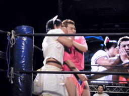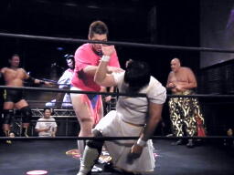 松永猛然と突進、佐藤はトミーボンバーをかわしてワキ固め、松永光速タップ(左写真)。