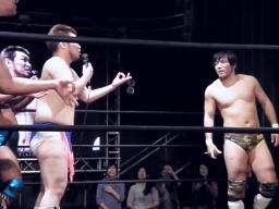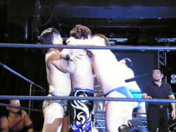 佐藤がHARASHIMAを羽交い絞め、佐藤逃がさずディーノはHARASHIMAにキス(左写真)。