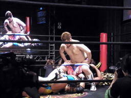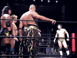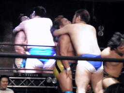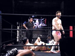 佐藤が最後にヘッドロック、しかしロープに振られ(右写真)5人のビッグブーツ喰らう。