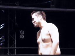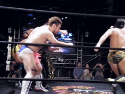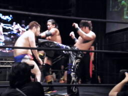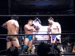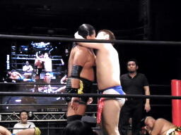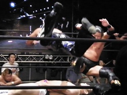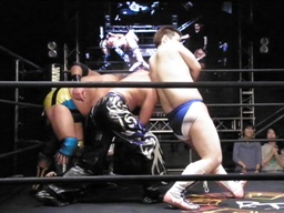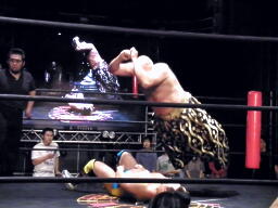 大鷲チョークスラム、HARASHIMAのスワンダイブプレスと大鷲のギロチンドロップと畳み掛ける(右写真)、HARASHIMAカバー、カウント2。