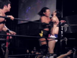 ロープに振ってダブルのガットショット(左写真)、大鷲延髄蹴り、HARASHIMAビッグブーツ。