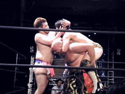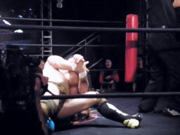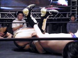 松永が佐藤に首固め、カウント2。佐藤ワキ固め、松永逆さ押さえ込みに切り返す、佐藤立ち上がるとワキ固め(右写真)、松永ギブアップ。