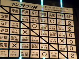 9/13大阪から始まったヤングドラマ杯星取表(左写真)。まだ全員1試合ずつしか終わってないので何がどうということはない。