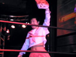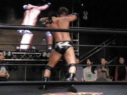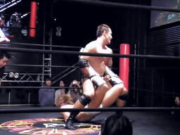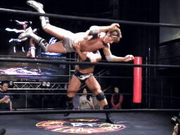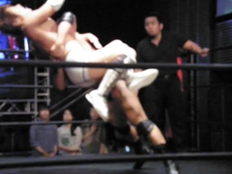 高尾コーナーに上ってミサイルキック(左写真)、カウント2。5分経過。