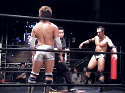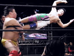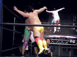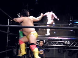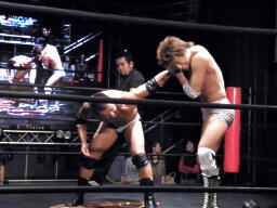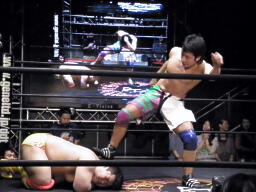 谷口バックドロップ狙うが高尾はブロック(右写真)。谷口ロープに振る、高尾ショルダーブロック、谷口ショルダーブロック返す、高尾ダウン。谷口ロープに飛ぶ、高尾カウンターのドロップキック。