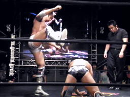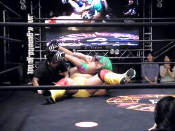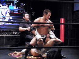 伊橋は立ち上がろうとした安部の腰にフライングソーセージ、これは強烈。伊橋すかさずエビ固め(左写真)、カウント3。