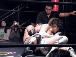 高尾フライングメイヤー(左写真)、谷口ヘッドシザーズで返す。高尾もう一度フライングメイヤーからグラウンドヘッドロックに。谷口エビ固め、カウント2。