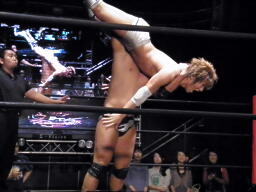 谷口ぶっこ抜きブレーンバスター(左写真)、カウント2。