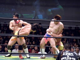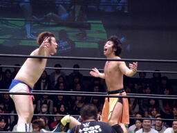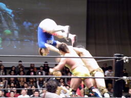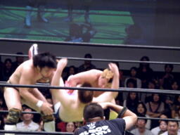佐藤と松永が捕まえて高梨ドロップキック、ディーノかわして佐藤と松永に誤爆(左写真)。ディーノは高梨にシャイニングあてがい。