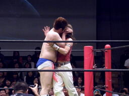 佐藤と松永はダブルのストマックブロック、松永がトミーボンバー(左写真)、佐藤がランニングヒップアタック、高梨がカバー、カウント2。5分経過。