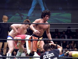 松永がディーノを捕まえ高梨に攻撃を促す。しかし高梨は佐藤、松永にトラースキックを連発(右写真)。