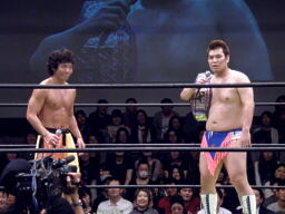 ディーノ「そもそもこんな前座試合に噛み付くなんて噛み付くところが間違ってる。私はアンタたちがベルト欲しいんだったら来てもらってもいい。」佐藤は長州のマネで聞き取り不可能な言葉を叫んで退場。