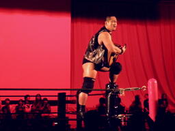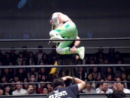 KUDOコーナーに上りダイビングダブルニードロップ(右写真)、カウント3。