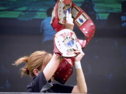 KO-Dタッグベルトを掲げるグレース(左写真)。