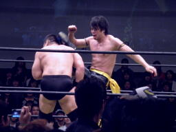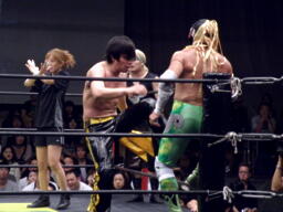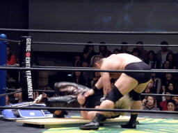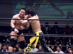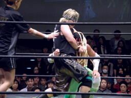 高木ガットショット、逆水平。KUDOはエルボー(左写真)。KUDOガットショット、ヘッドロック。高木ロープに振る、ショルダーブロックの打ち合い。高木ロープに飛ぶ、KUDOカウンターで逆水平打つが高木はそれをハネのけてショルダーブロック。