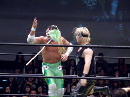 先発はウラノとサスケ。ロックアップからウラノが腕を固める(右写真)、サスケは十字に切り返す、ウラノブロック。