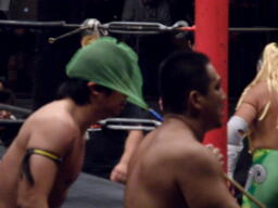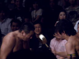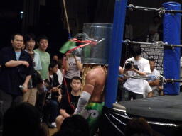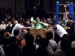 高木がKUDOをひしゃくで殴ろうとするがKUDO取り上げて逆に殴る(左写真)。ひしゃくは音が間抜けだなあ。サスケとウラノがリングに戻る。ウラノ低空ドロップキック。5分経過。
