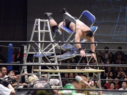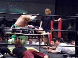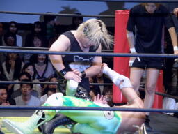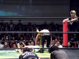 KUDOを和桶に固定してコーナーに上るがウラノがデッドリードライヴ(右写真)。