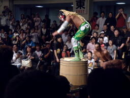 サスケ今度は和桶の上に乗って突撃(左写真)、またもかわされ客席に突入。