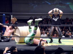 今度はKUDOがサスケを和桶に固定してダイビングダブルニードロップ、サスケかわし(左写真)KUDOは正座の姿勢のまま和桶にすっぽり。即身成仏。15分経過。