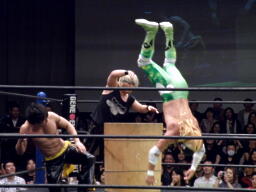 高木2人まとめてバックフリップ(右写真)、KUDOをカバー、カウント2。