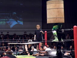 高木はサスケに和桶の中に入らせると台車に載せて突撃(右写真)、KUDOもウラノもかわしたためサスケは鉄板に激突。10分経過。